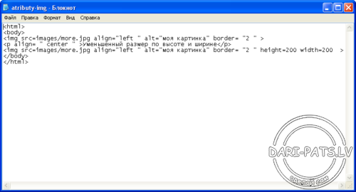 <img src=images/more.jpg align=»left » alt=»моя картинка» border= «2 » height=200 width=200 >