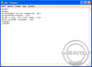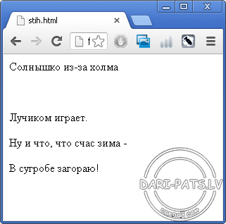 Я обещал написать, как сделать стишок на сайте так вот это делает тегом <br> он уже устарел и используется редко, но все же я покажу, как им пользоваться. Вот начало нашего стишка: